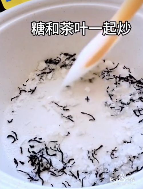 1.将准备好的茶叶和白砂糖放入锅中。(根据个人口味适量,建议茶叶与白糖比例1:2)