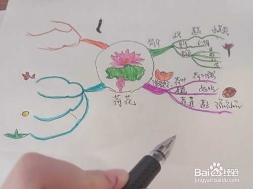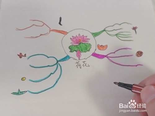 根据每个分支的内容画出毛笔,荷花,金元宝,小鱼,鸭蛋和小木船的图画,如图所示。