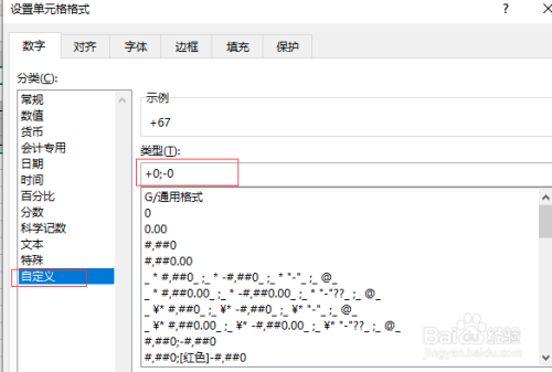 弹出单元格格式窗口,选择自定义,在类型中输入+0;-0