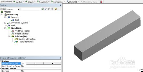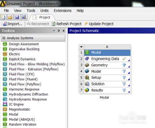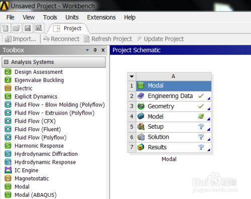 打开Ansys Workbench软件,拖拽一个模态分析上去(Modal)。