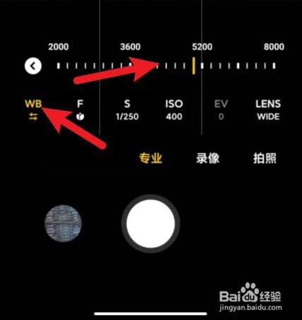 打开相机,然后点击专业模式,将白平衡调节至5000左右。
