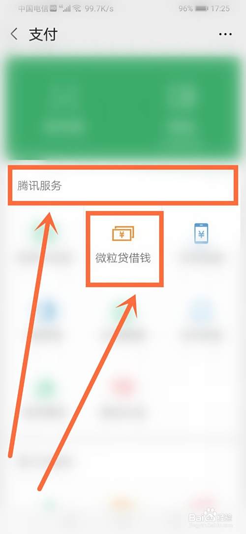 进入支付页面后,点击【腾讯服务】功能下方的【微粒贷借钱】进入。如下图所示
