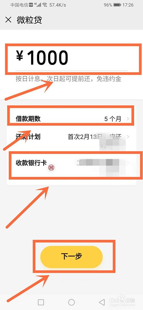 输入【要借的钱数】,点击选择【借款期数】和【收款银行卡】,并点击【下一步】进入