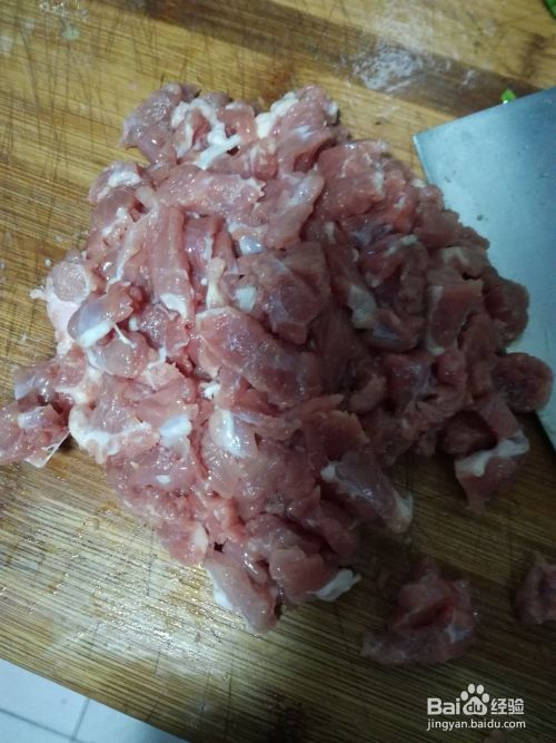 牛肉洗净,用菜刀顺着纹路切小块,如果家里有小孩的话尽量切小哦