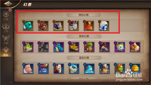 橙色幻兽在游戏中是非常少的,而且相比于其他品质的幻兽来说种类更少,目前游戏中只有6个橙色幻兽,在幻兽【图鉴】中可以看到。