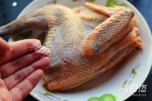 2手上蘸适量盐,把鸡内外用盐按摩一遍;