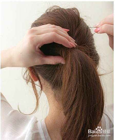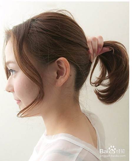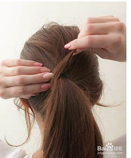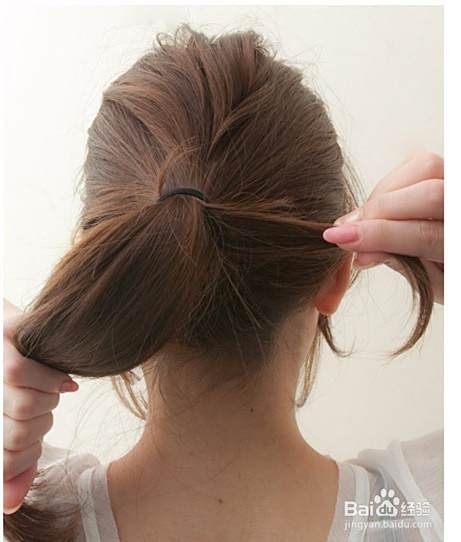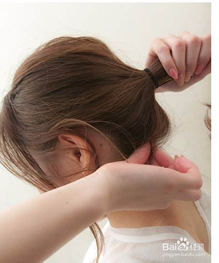 用橡敏近菊皮筋将马尾扎好,并一只手固定住马尾另一只手稍稍拉扯一下马尾下面喝往的头发。