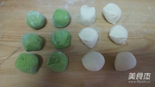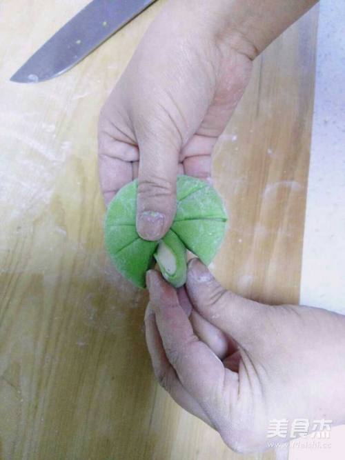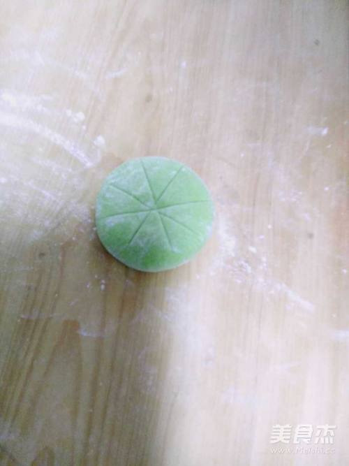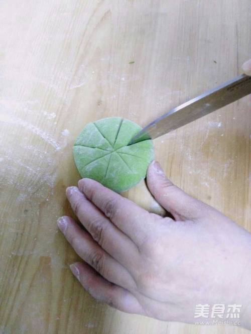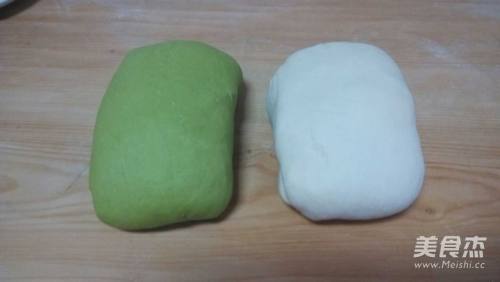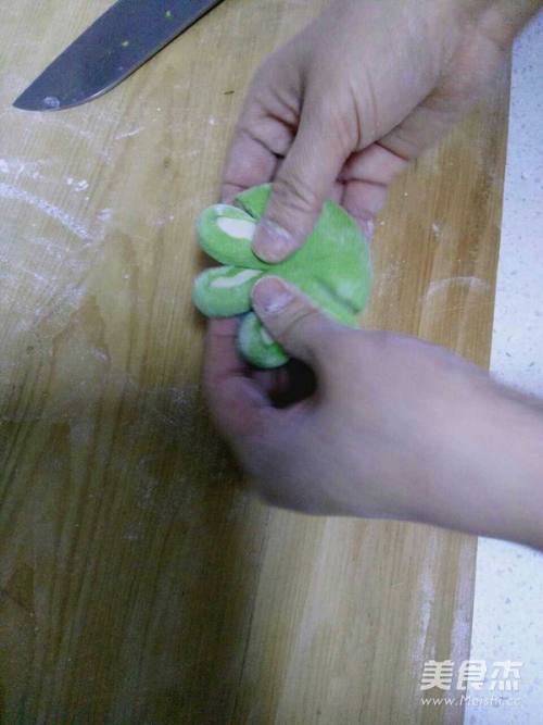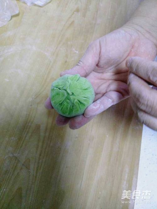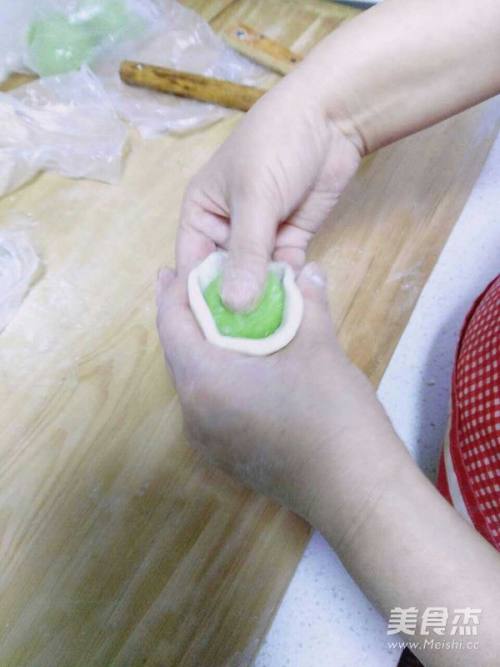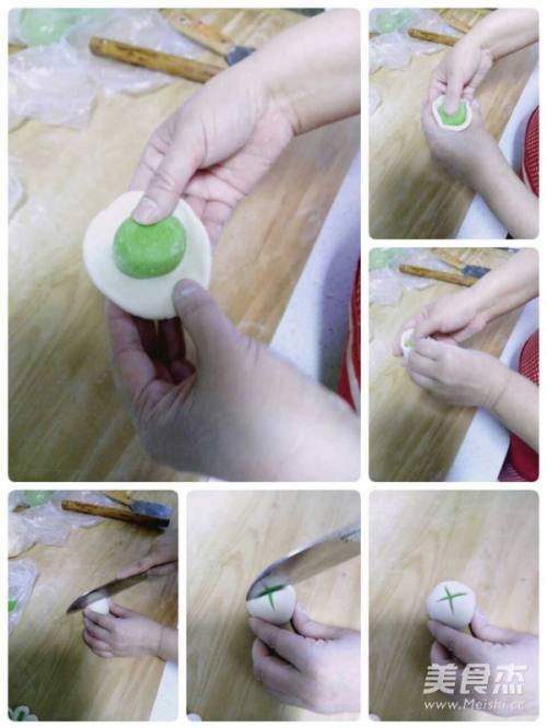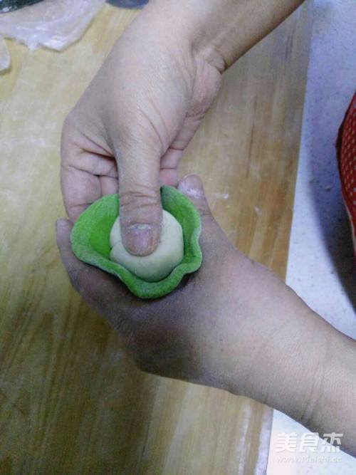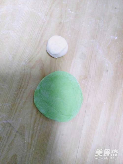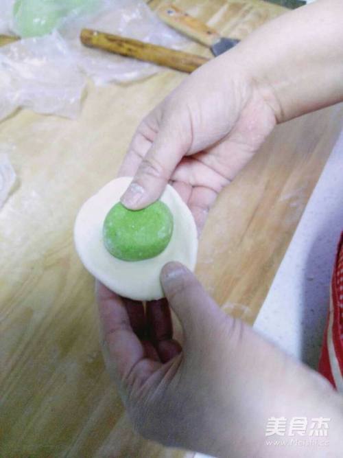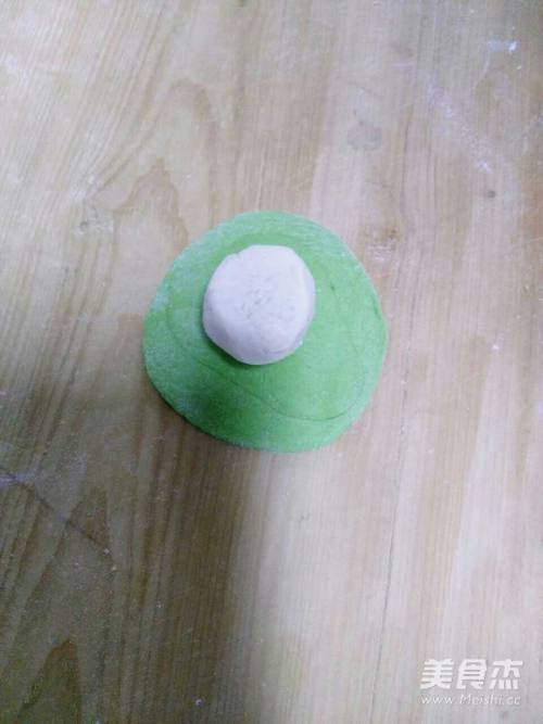 6擀绿色面皮,将白色面团包上。