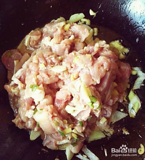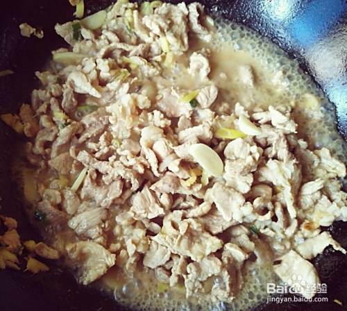 将调制入味的猪肉倒入锅中,快速翻炒均匀至半熟。