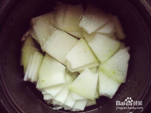 ②冬瓜:清洗干净后,切成块状,放于水中备用,防止氧化(时间不可过长,防止营养流失,建议现切现用);