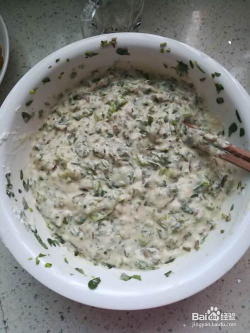 加入适量的水和面、把三个鸡蛋也打入,早餐还是不能光有青菜还要增加些蛋白质,丰富下营养。