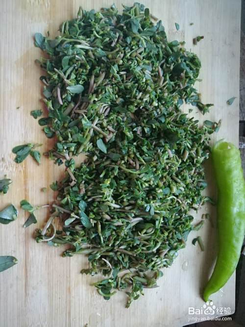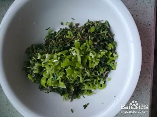 因为马蜂菜没有其它的味道,所以我放了一个青辣椒,对喜欢辣的朋友们比较适合,增加点味道,同时辣椒维生素也很丰富,一举多得,同样切碎后放入。