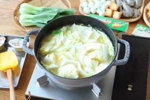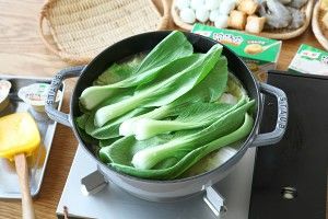煮开后开始依次放入食材。先铺入大白菜,再放一层小青菜