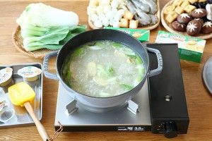倒入适量的开水,煮开。加入浓汤宝。中大火煮开
