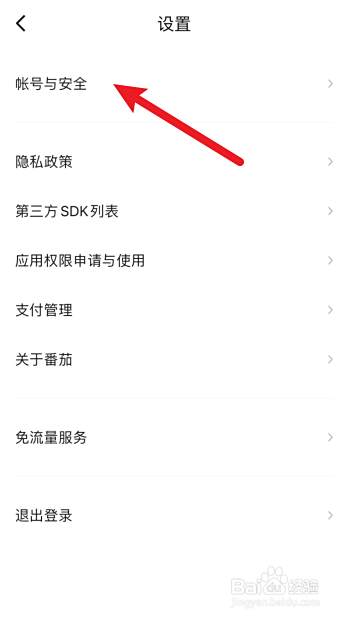 登录番茄畅听APP,进入“我的”,点击“设置”。进入设置页面,点击“账号与安全”。