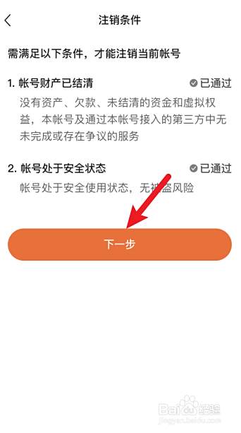 输入手机验证码验证身份后,点击“下一步”。查看注销条件,点击“下一步”。