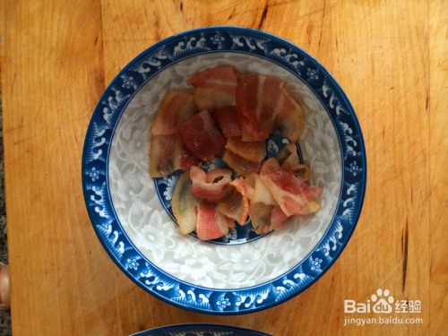 培根放入平底锅中煎熟,切成块放入碗中备用。