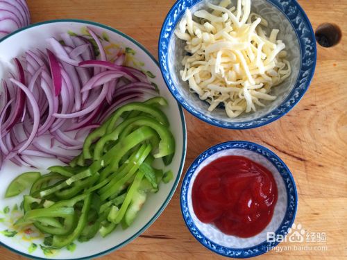 把元葱和青椒切成丝,放在盘中备用。马苏里拉奶酪和番茄沙司倒入小碗中准备好。