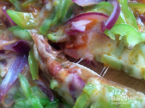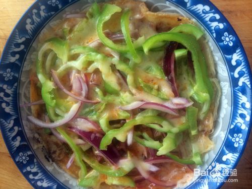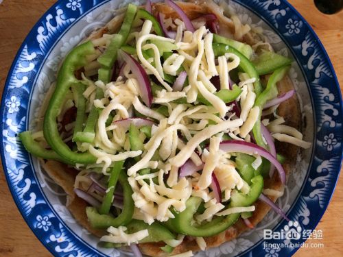 再洒上一层青椒丝和元葱丝,然后最上面再放上一层马苏里拉奶酪。