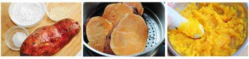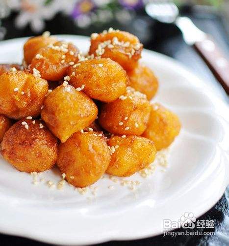 <p>原料:红薯蒸熟去皮后1000克、糯米粉约250克、白糖和熟芝麻适量。<br></p>