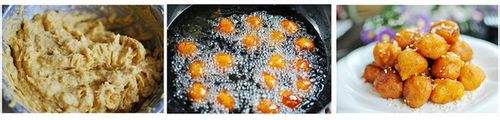 用大拇指和食指的虎口处挤成大小均称的丸子,放温油中小火炸至全部在油中浮起,呈金黄色捞出。