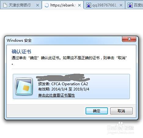 点击左侧的 个人网银专业版 登陆,弹出证书窗口,点击确认。输入USBKEY密码正确后才会到用户名登陆界面(USBKEY连续输错6次的话就要去银行解锁啦,小心谨慎啊)