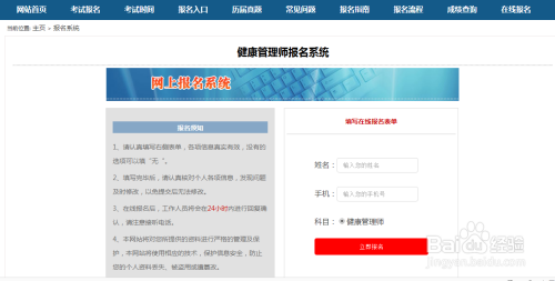 第三步:自身条件确认过后,点击报名网站导航栏中的,《在线报名入口》,进入在线报名通道,填写报考信息,提交申请,后会有四川健康管理师考试报名中心工作人员与你电话核对报考信息和后期学习安排。请保证联系方式畅通,以免错失报考机会