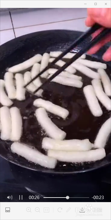 然后将面团儿擀成饼状,再切条。再在冷油中下入米条,