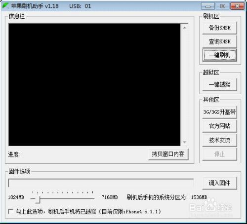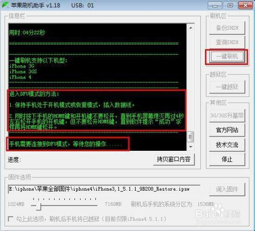 注意:刷机工具有保基带功能,即使你用原厂固件刷机,刷完还是手机原有的基带版本。第七步.点击"一键刷机",准备刷机。这时软件会提示你让手机进入DFU模式,如下图所示: