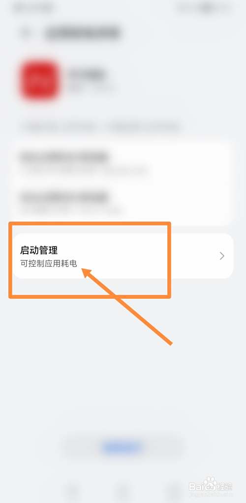 进入耗电快的软件页面后,点击启动管理,如下图所示: