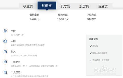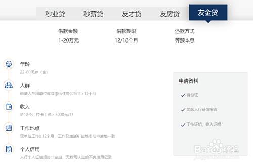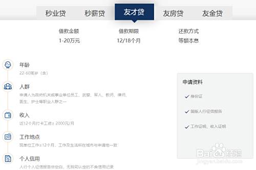 友房贷即申请人名下房贷正在还款中,且还款时间在6个月以上;近一年每月工资收入不低于2000元;现工作单位工作在1年及以上,工作生活的城市和申请地一致;并且个人征信报告没有友信普惠认定的不良信用记录。