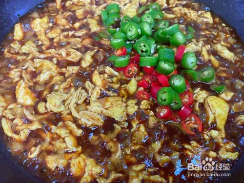 酱汁烧开,加入青红辣椒圈,继续咕嘟