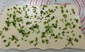 所有材料揉成团,过压面机至纯滑,花卷水用少点,擀成面皮,扫油,撒盐,葱花,折叠起来。