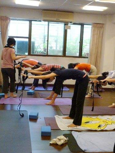 吐气时身体往前弯,背尽量挺直,每次延展想着脊椎都再延伸、再拉长。