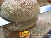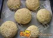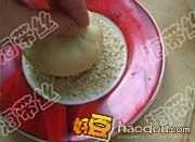4适量芝麻放在盘里,面团表面刷全蛋液,揪住面团底部,让面团表面在装芝麻的盘子里沾上适量芝麻,翻面排上烤盘,用手稍微把面团压平一些