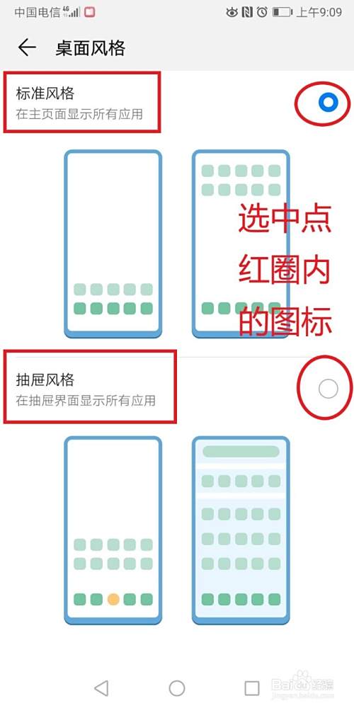 【桌面风格】功能页面中显示两种桌面风格,一种是【标准风格】,一种是【抽屉风格】,选中【抽屉风格】功能。