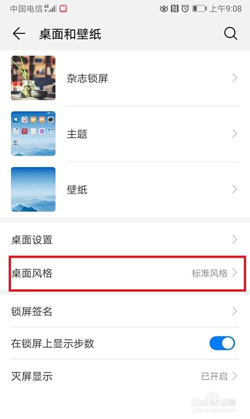 在【桌面和壁纸】功能页面中,找见【桌面风格】功能按钮,点击启动【桌面风格】功能,进入【桌面风格】功能页面。