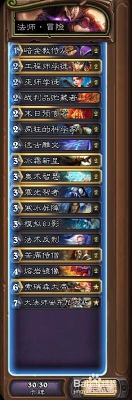 法师在对阵巫妖王时会在对手的1费回合被变成1血,因此在开局阶段我们要找到暗金教侍从和法术反制来破掉巫妖王的法术,进而利用过牌来尽快的找到索瑞森森大帝、巫师学徒以及大法师安东尼达斯等关键牌,在减费后我们可以配合熔岩镜像来轻松获得4个以上的巫师学徒,进而利用无限火球来在单回合解决掉巫妖王。