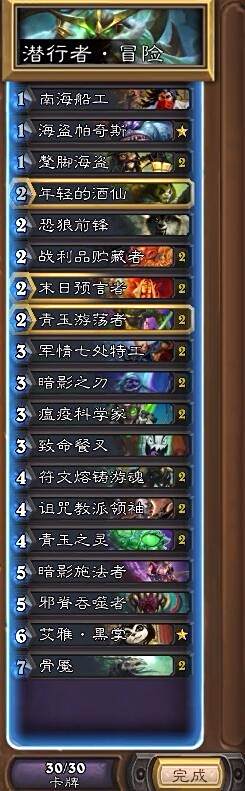 潜行者同样是过关相对简单的职业之一,面对巫妖王时潜行者会被消灭手牌以及牌库中所有的法术,因此我们在组建套牌时就应该选择一套没有法术的随从贼,在与巫妖王的对战中潜行者只需要做到按费上怪即可轻松过关,值得一提的时在7费回合你一定要打出末日预言者,否则将很难解决巫妖王召唤的2/6灵魂。只要你能够在7费回合准时摸到末日预言者,那么这场对战你就可以轻松的取得胜利。