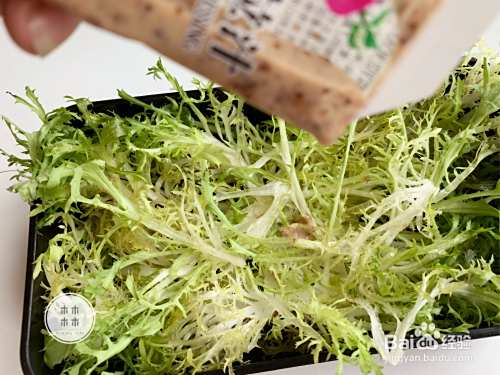 先把苦菊切去根部,用手撕成小片,摆到便当盒里,注意不要压的太实,然后浇上一些咸口的芝麻沙拉酱