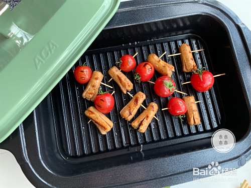 小烤肠一端切十字花,用牙签把烤肠和小番茄两个两个的串起来。多功能锅预热刷一层薄油,把串好的烤肠和小番茄煎熟