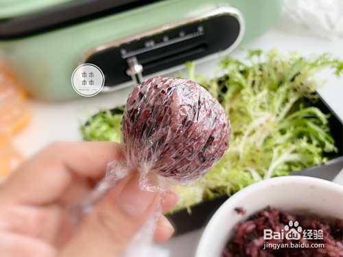 紫米饭加适量寿司醋或者沙拉酱拌匀,用保鲜膜裹起来整理成圆球状,摆到苦菊上