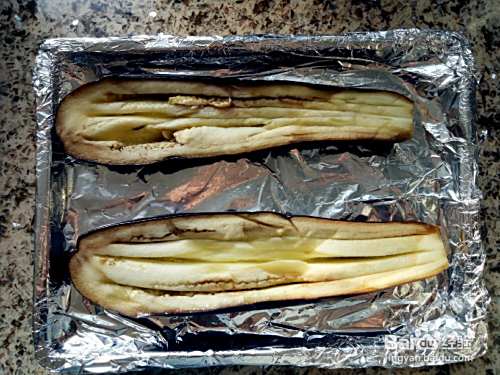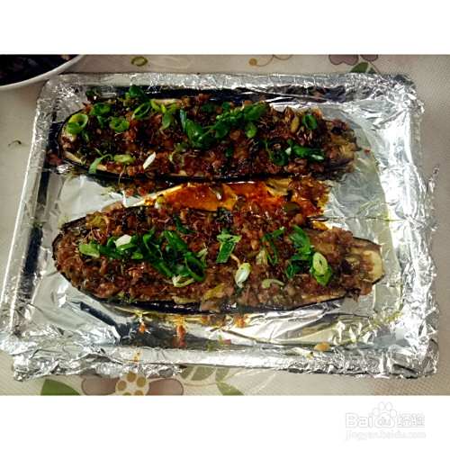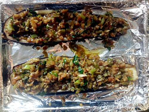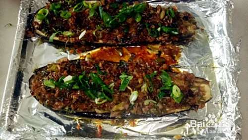 将炒好的酱倒入蒸好的茄子上,撒一些孜然,可以放到划痕里,更加入味。进入烤箱200度20分钟。