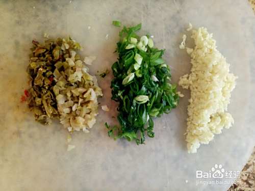 茄菊迅子蒸的时候,把蒜切泥,葱切碎,乌江榨菜和豇豆角切丁备用。