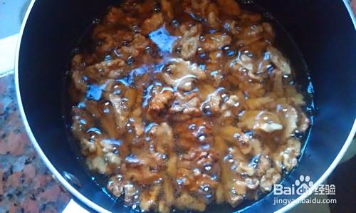 核桃洗净去皮,沥干水份,放入冷油冷锅内炸至香脆。