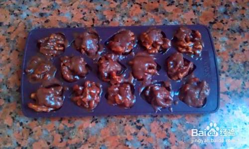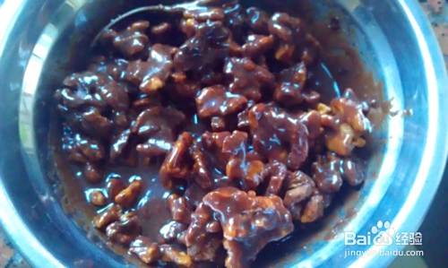 接着把炸好的核桃加入巧克力酱内拌匀。