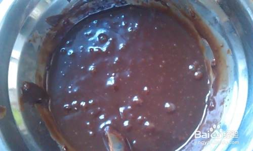 巧克力隔水加热融化,并加入适量的淡奶油与白砂糖调好口味。