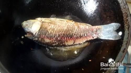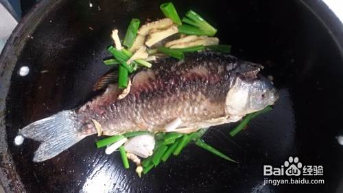 煎至两面都微微发黄了,利用鱼两侧的油放入花椒煸香,再入葱、姜、蒜爆香。
