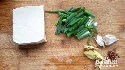 准备好葱、姜、花椒和豆腐,备用。