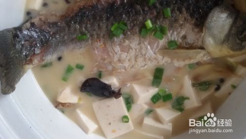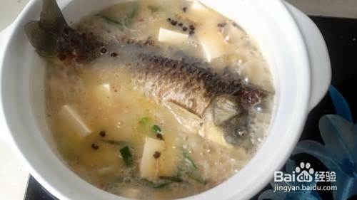 移入砂锅,加入适量的水,与鱼身平齐,大火炖煮,汤呈现奶白色,就可以加入适量的醋、白糖、味极鲜,打入豆腐块了,把豆腐放在手上,直接打入沸水中,不容易碎掉。